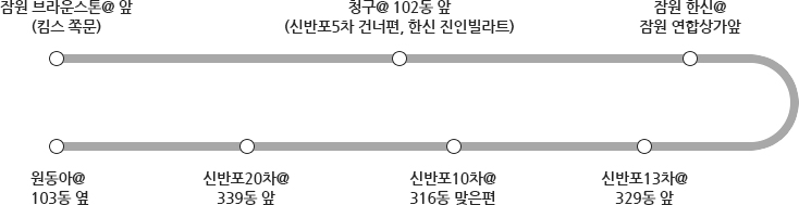 잠원브라운스톤@ 앞 > 청구@ 102동 앞 > 잠원한신@ 잠원연합상가 앞 > 신반포13차@ 329동 앞 > 신반포10차@ 316동 맞은편 > 신반포20차@ 339동 앞 > 잠원동아@ 103동 옆